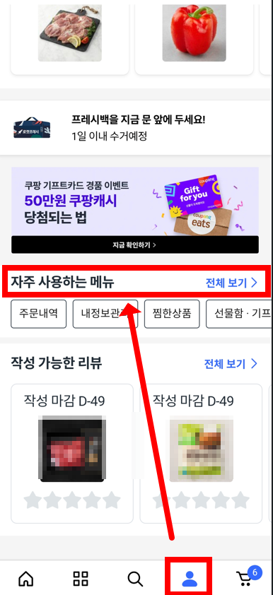쿠팡 하단의 사람모양을 누른뒤 중간 쯤에 위치한 [자주 사용하는 메뉴] 클릭합니다.