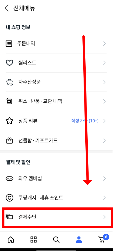 - 마이쿠팡 → 전체 메뉴 → 결제 수단 관리