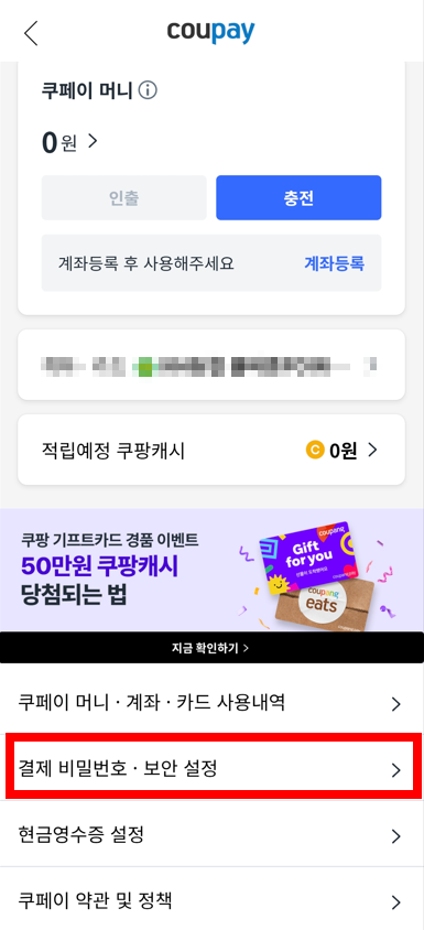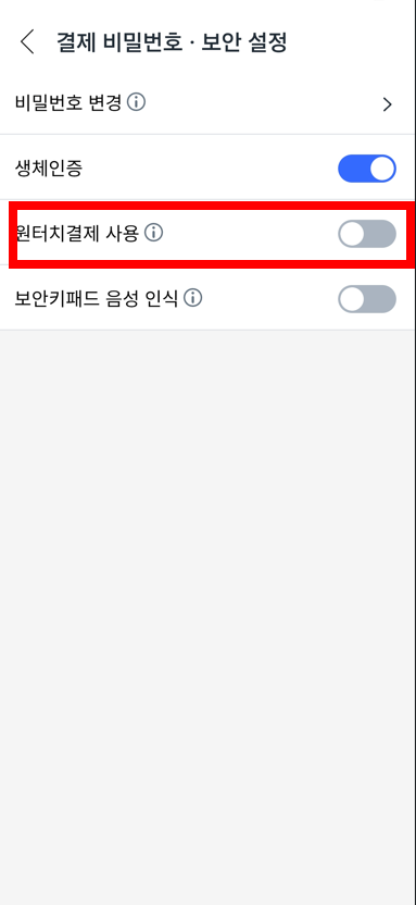 [결제 비밀번호 보안설정]을 눌러서 [원터치결제 사용]을 꺼주면 됩니다.